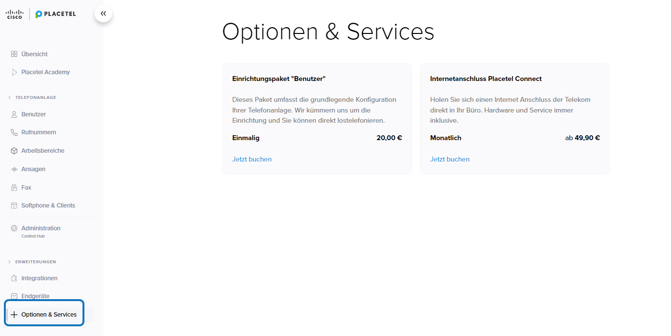 Unter Optionen & Services finden Sie sowohl weitere Produkte, die den Umgang mit Webex für Placetel erleichtern, oder diesen Erweitern.