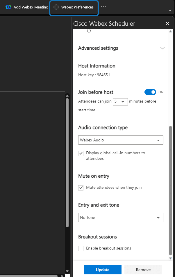 Sobald Sie auf Add Webex Meeting und ein Webex Meeting hinzugefügt haben, können Sie per Klick auf Webex Präferenzen weitere Einstellungen vornehmen.