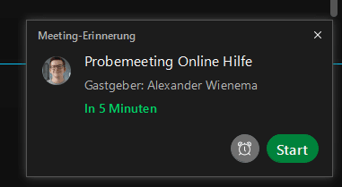 10 Minuten bevor das Meeting startet, erscheint auch bei Webex ein Pop-up Fenster, welches an das Meeting erinnert.
