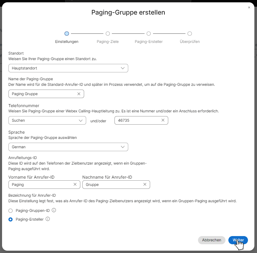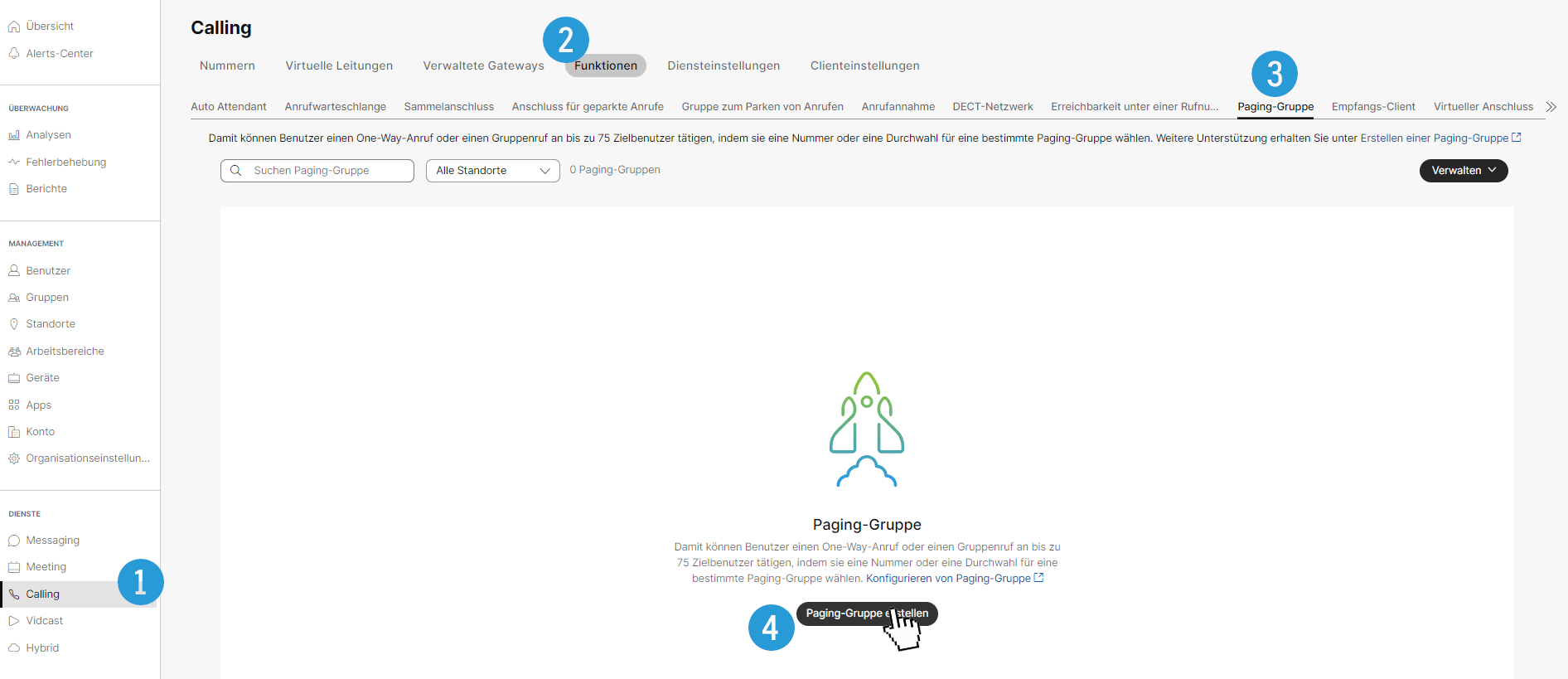 - Paging-Gruppen funktionieren nur über physische Endgeräte (nicht bspw. über Webex)