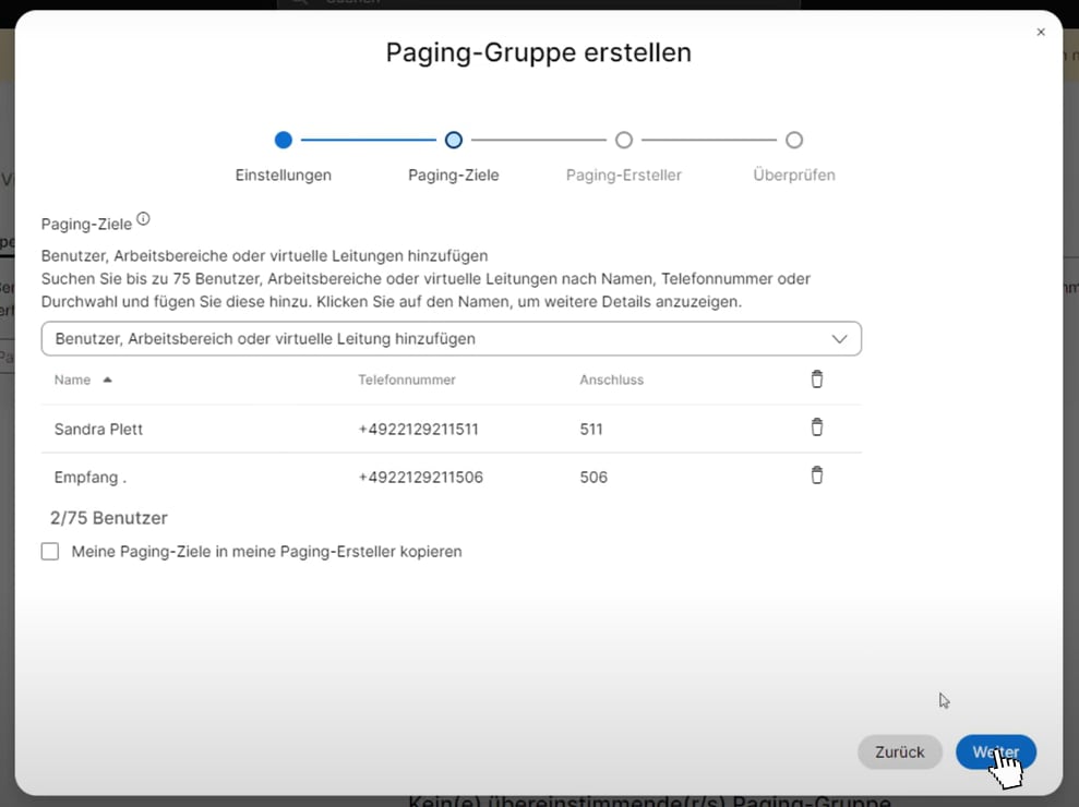Als nächstes bestimmen Sie die Ziele der Paging-Gruppe. Das sind die Geräte, auf denen angerufen wird.