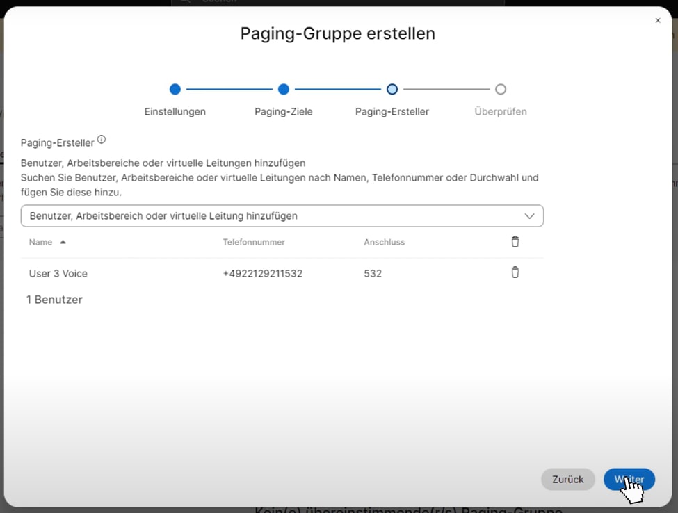Unter Paging-Ersteller legen Sie fest, er die Nachrichten verschicken kann. Analog zu den Zielen, wählen Sie hier wieder nicht die konkreten Endgeräte, sondern die damit verbundenen Benutzer, Arbeitsbereiche oder virtuellen Leitungen aus.