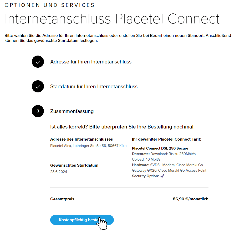 Nach Auswahl der Adresse und des Schaltungsdatums können Sie dann unter Zusammenfassung Ihre Bestellung überprüfen.