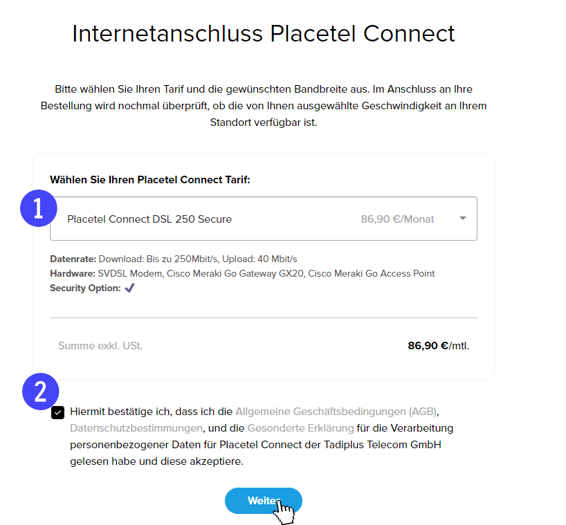 Akzeptieren Sie zudem die Allgemeinen Geschäftsbedingungen, Datenschutzbestimmungen und die gesonderte Erklärung für die Verarbeitung personenbezogener Daten unseres Partners der Tadiplus Telecom GmbH.