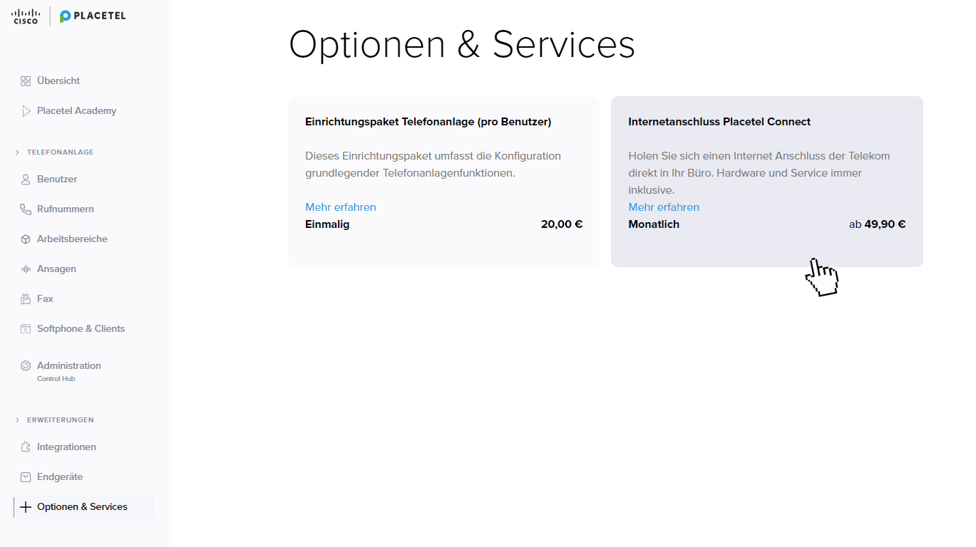 Sie finden Placetel Connect unter den Optionen und Services.