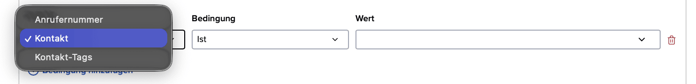 Bitte beachten Sie, dass wir bereits verschiedene Kontakte definiert und ihnen Tags zugewiesen haben. Wenn Sie keine Tags für Ihre Kunden erstellt haben, ist diese Art von Bedingung für Sie nicht möglich! Sie können jedoch jederzeit Bedingungen anhand der eingehenden Rufnummer definieren.