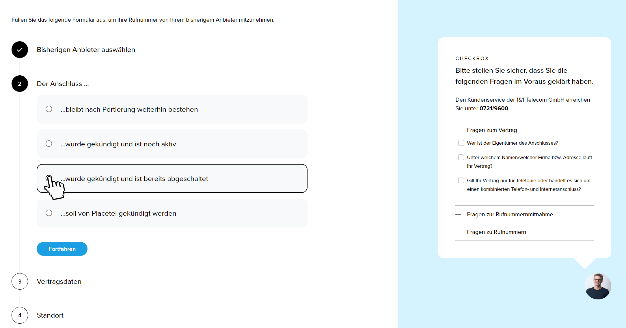 - Geben Sie im nächsten Schritt Ihre Vertragsdaten ein und klicken anschließend auf „Fortfahren“. Beachten Sie die Checkbox auf der rechten Seite und prüfen Sie die entsprechenden Informationen zu Ihrer Portierung.