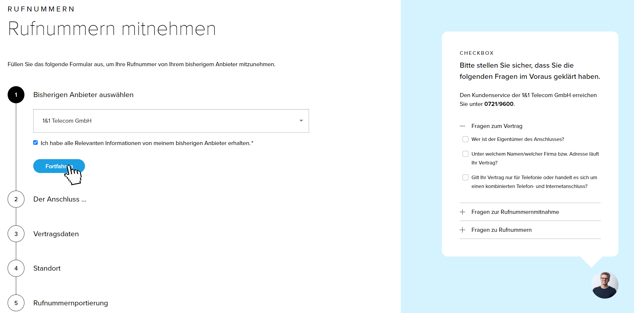 Auswahl: Bestehende Rufnummern mitnehmen - Wählen Sie Ihren bisherigen Anbieter und klicken Sie anschließend auf „Fortfahren“. Bitte beachten Sie die Checkbox auf der rechten Seite und haben Sie Ihren Vertrag und/oder Rechnung Ihres vorherigen Anbieters zur Hand.