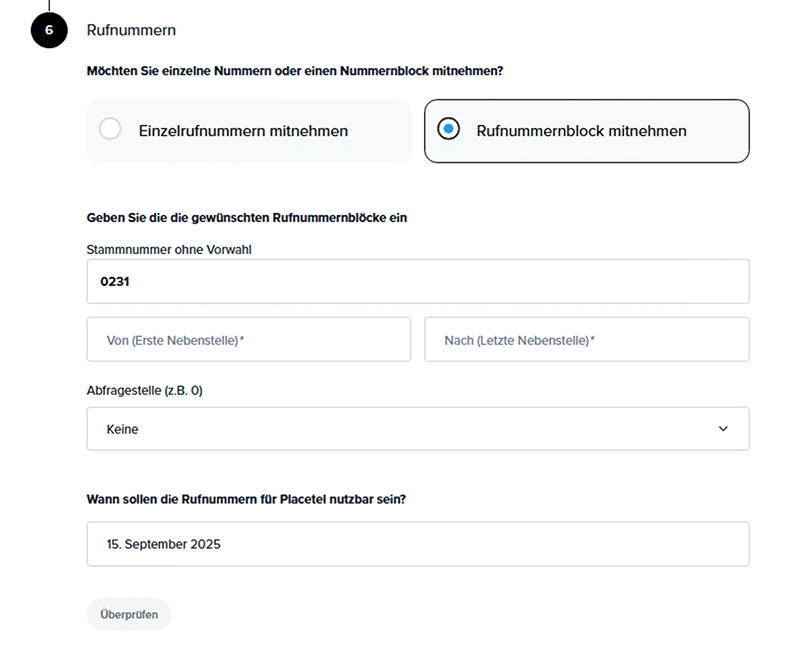 Verifikation neuer Vorwahlbereich - Nun geht es um die Angabe der Rufnummern, die zu Portieren sind. Hier können Sie entweder: