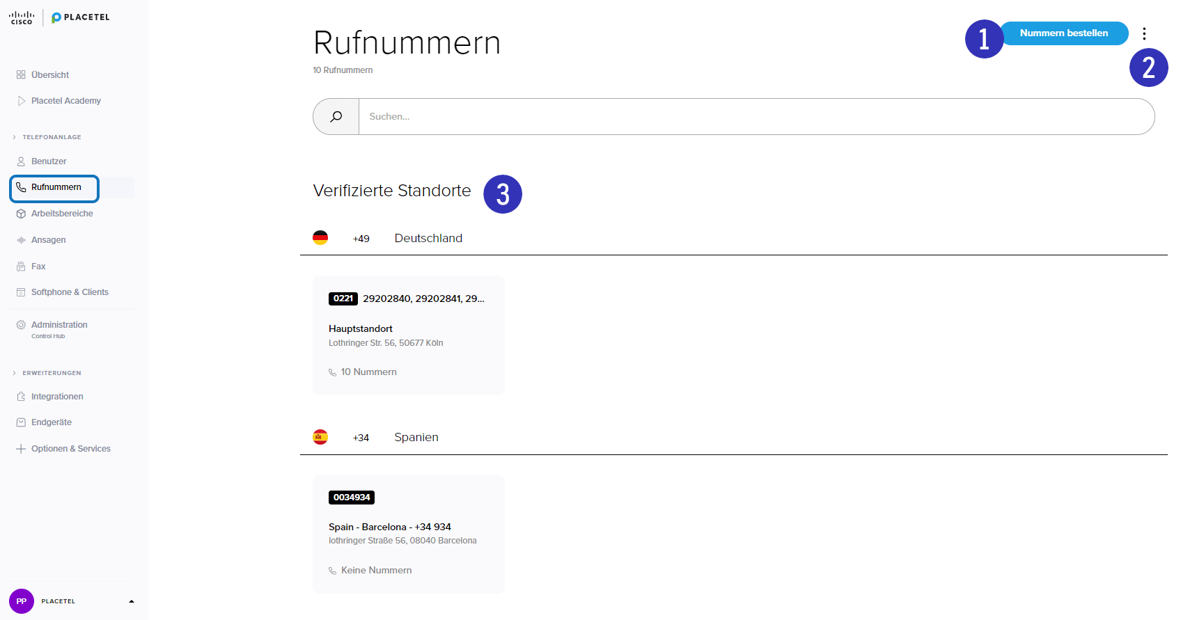 Rufnummern, die Sie bei Webex für Placetel bestellen können sind die folgenden: -