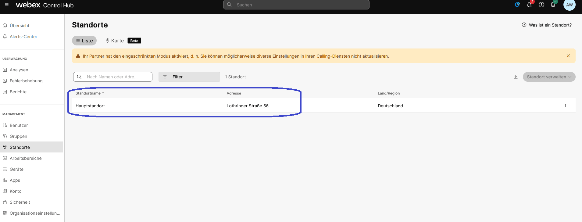 In Webex für Placetel wird für jeden Kunden auch ein „Standort“ angelegt.