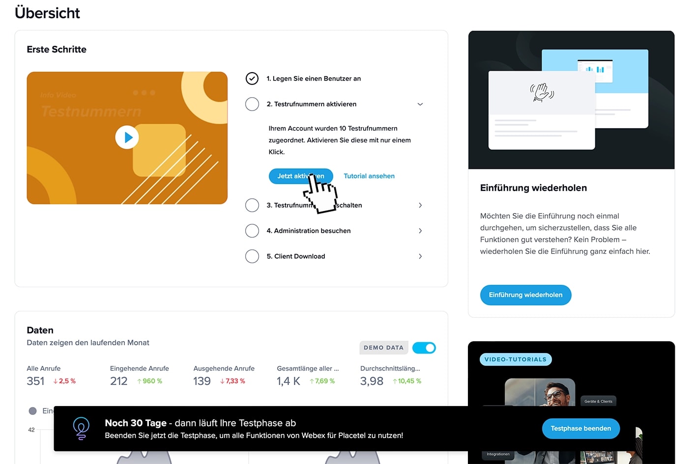 Klicken Sie in der Übersicht bei Testrufnummern aktivieren auf Jetzt aktivieren: