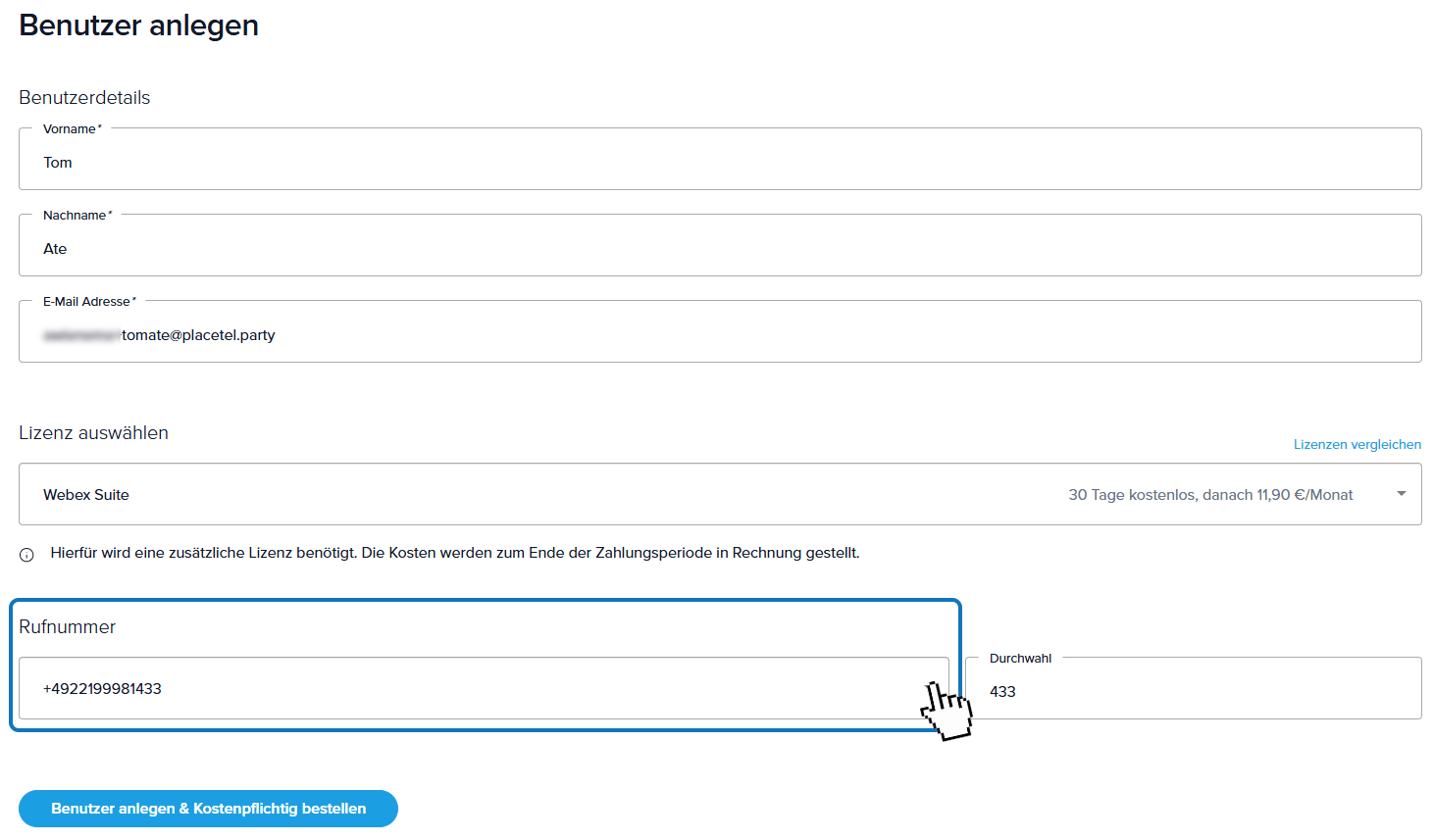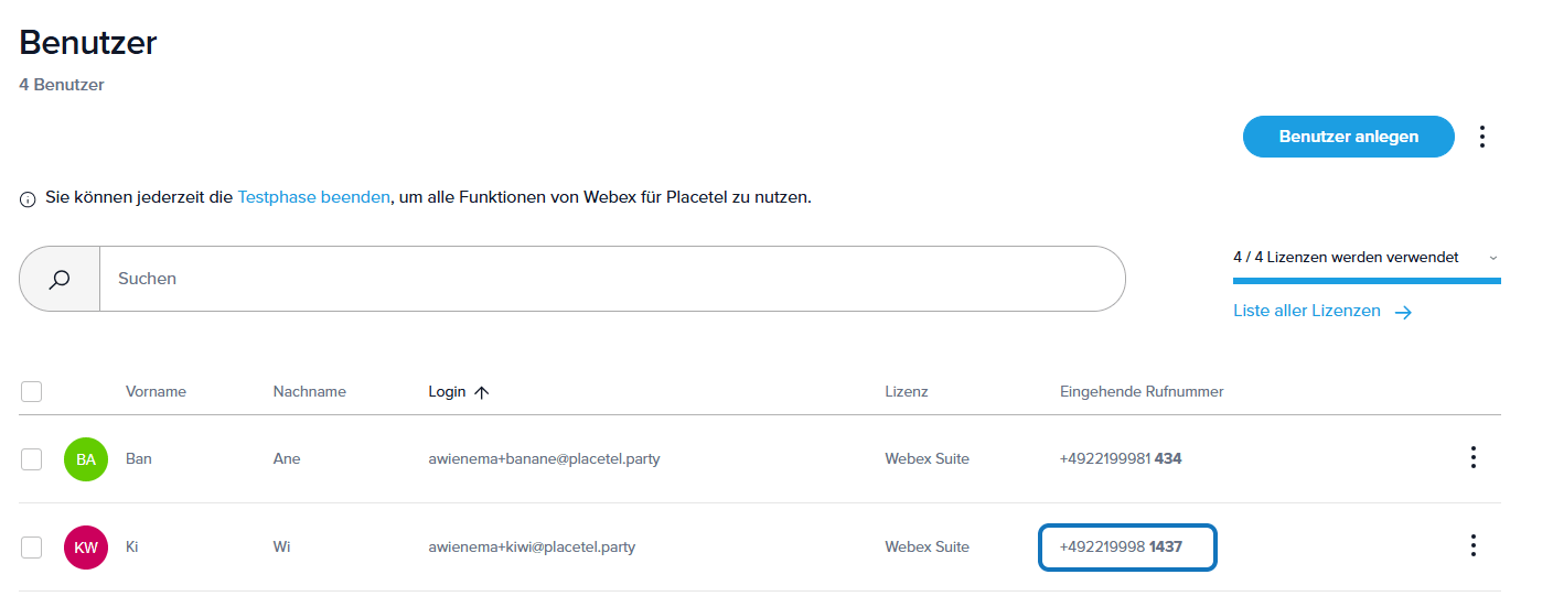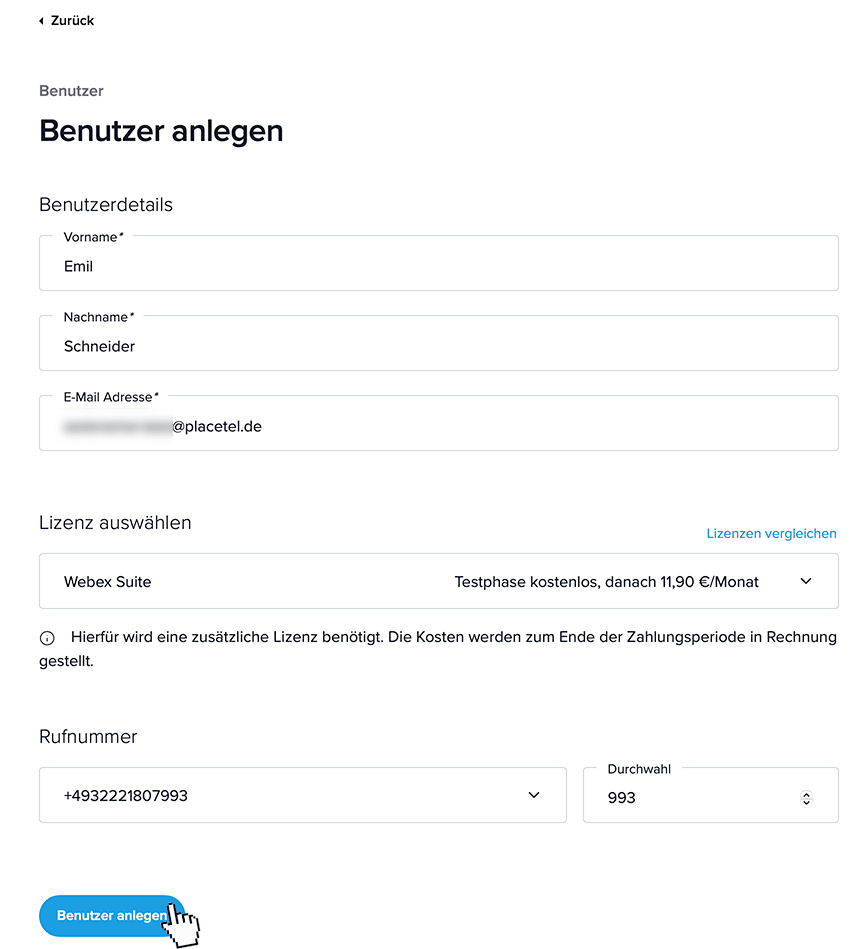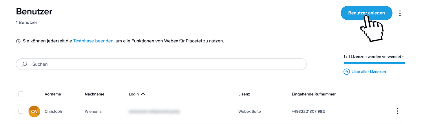 Während der Testphase können Sie noch einen weiteren Benutzer anlegen, welcher ebenfalls Webex für Placetel testen kann. Wie Sie einen weiteren Benutzer anlegen und mit einer Lizenz ausstatten können, erfahren Sie im folgenden Text.