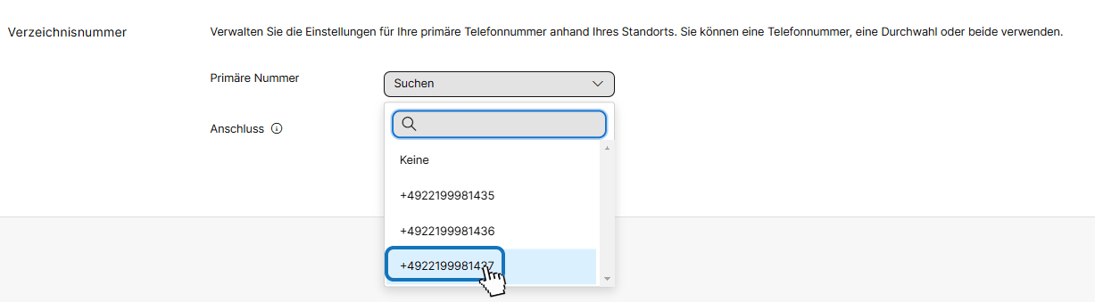 4.) Wählen Sie dann bei Primäre Nummer in dem Dropdown-Menü die Rufnummer aus, die Sie für den Benutzer verwenden wollen.