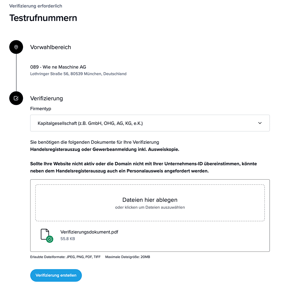 Der Vorwahlbereich ist hier bereits mit Ihrem Hauptvorwahlbereich vorausgewählt. Laden Sie anschließend ein Dokument zur Verifizierung hoch.