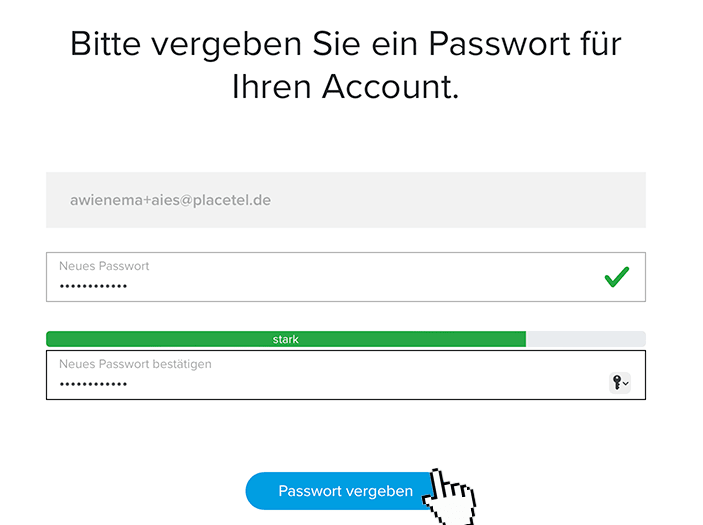 Status: Ihre Mitarbeiter akzeptieren die Einladung in der E-Mail - Der von Ihnen eingeladene Benutzer vergibt sich dann ein Passwort und muss unsere Nutzungsbedingungen und Datenschutzbestimmungen akzeptieren. Abschließend klickt er auf Passwort vergeben.