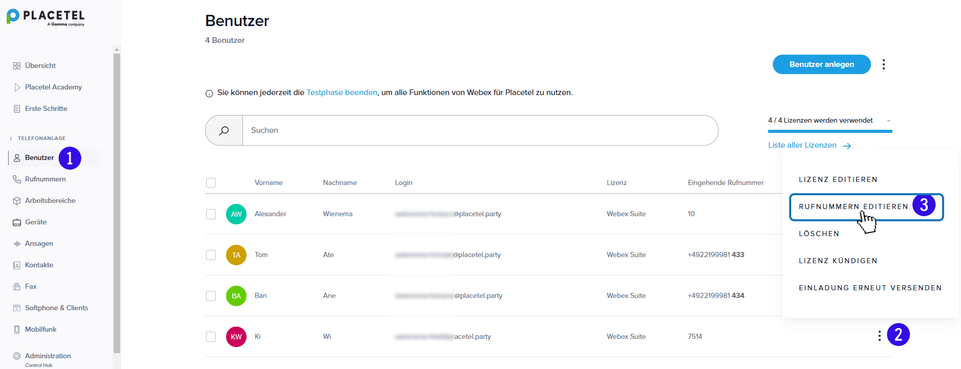 - Rufen Sie im Placetel Order Portal Ihre Benutzer auf.