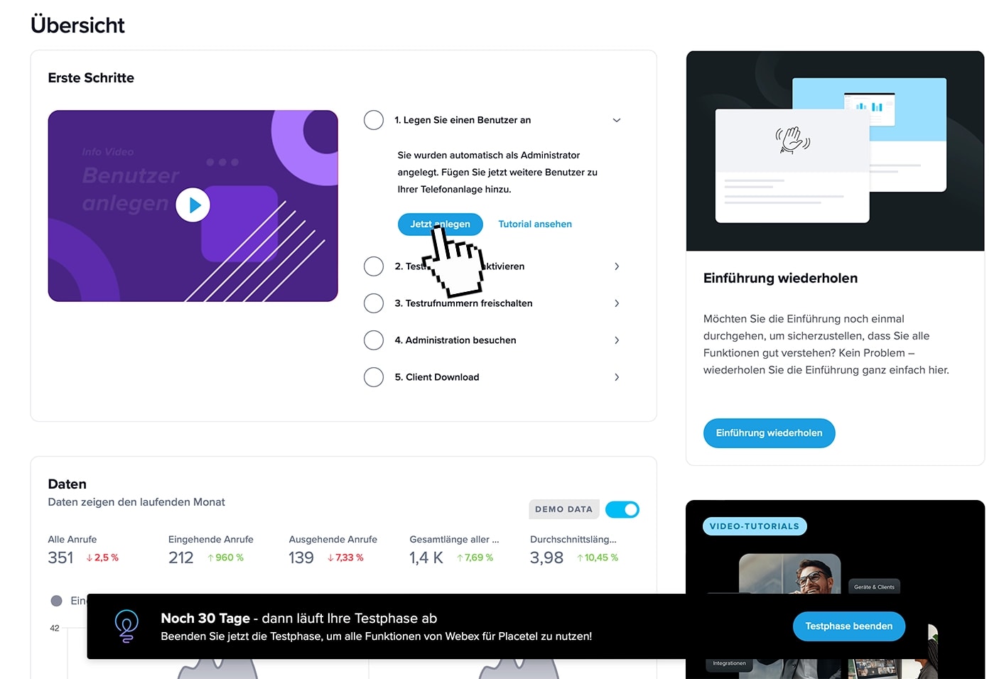 Während der Testphase zu Webex für Placetel stehen Ihnen 10 Testrufnummern zur Verfügung. Diese werden schon automatisch in Ihr Kundenkonto eingespielt.