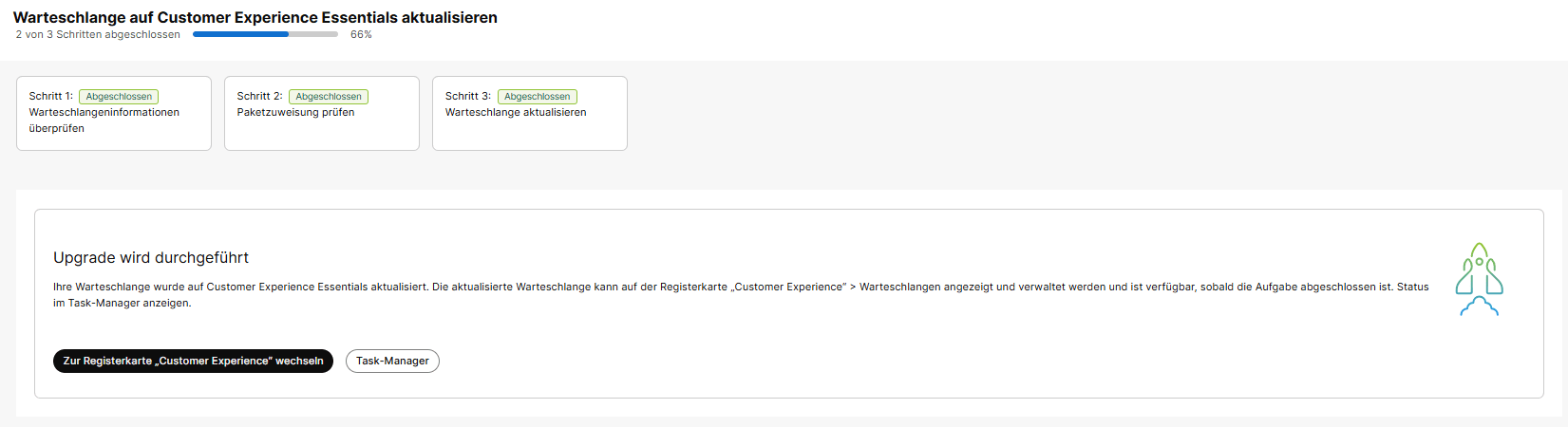 Ihre Warteschlange wurde auf Customer Customer Assist aktualisiert. Die aktualisierte Warteschlange kann auf der Registerkarte „Customer Experience“ → Warteschlangen angezeigt und verwaltet werden und ist verfügbar, sobald die Aufgabe abgeschlossen ist. Status im Task-Manager anzeigen.