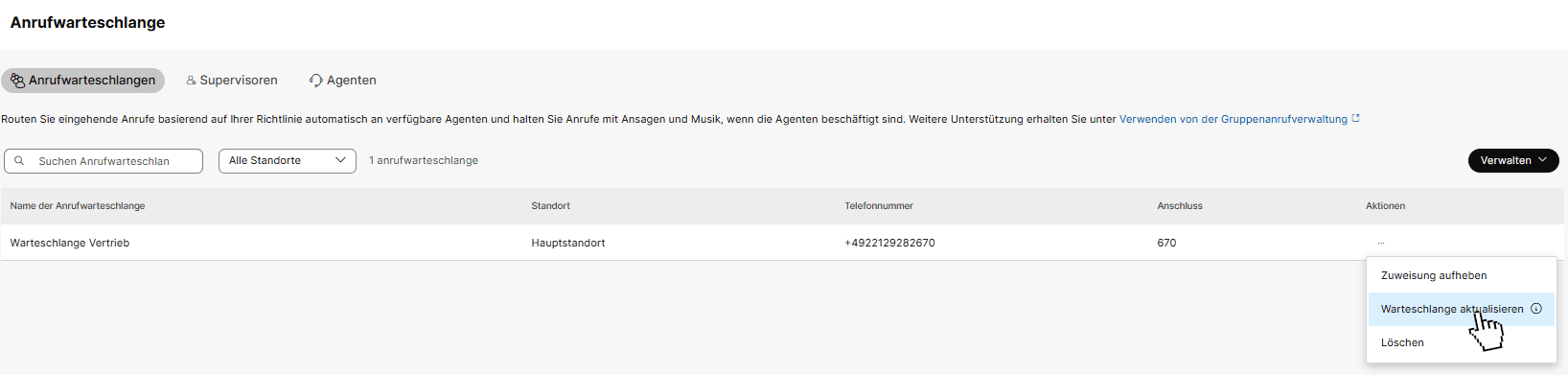 2.) Klicken Sie dann bei der entsprechenden Warteschlange - unter Aktionen - auf Warteschlange aktualisieren.