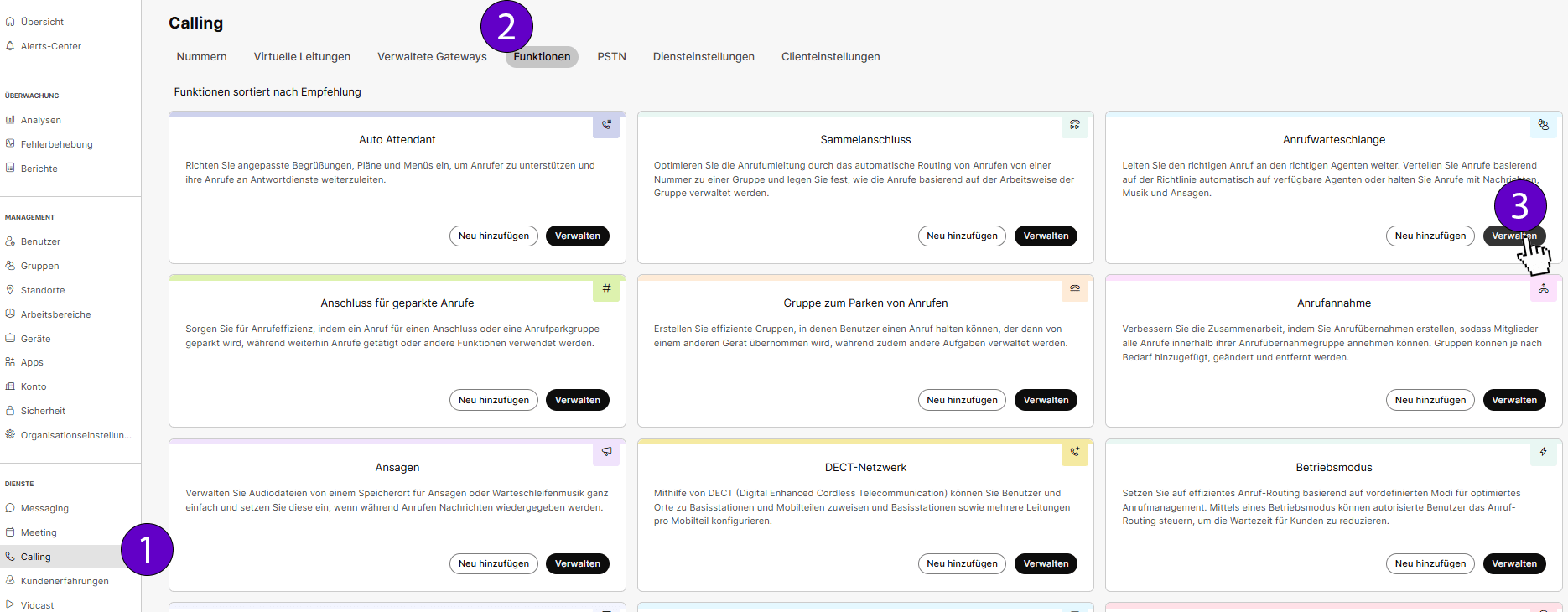 Dienste: Calling → Funktionen → Anrufwarteschlange: Verwalten