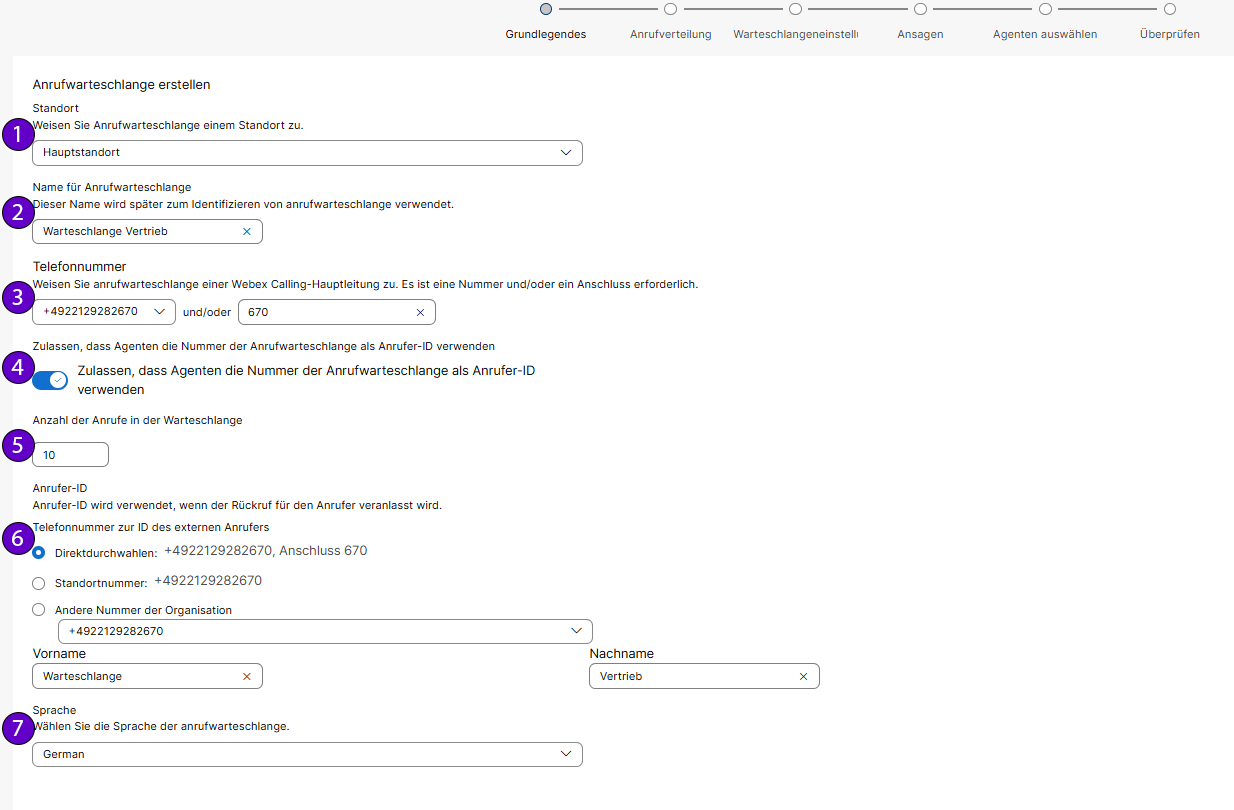 (2) - Vergeben Sie dann einen Namen für die Anrufwarteschlange. (3) - Wählen Sie dann aus dem Dropdown-Menü die Telefonnummer aus, unter der die Warteschlange erreicht werden soll und optional können Sie im Anschluss-Feld auch eine Durchwahl festlegen. (4) - Geben Sie an, ob die festgelegte Warteschlangentelefonnummer auch für ausgehende Anrufe genutzt werden kann. Klicken Sie dafür auf den Regler. (5) - Wählen Sie dann aus, wie viele Anrufe sich gleichzeitig in der Warteschlange befinden können. (6) - Legen Sie im Anrufer-ID-Bereich die Informationen für den Fall fest, wenn über die festgelegte Rufnummer auch ausgehende Anrufe tätigen soll. (7) - Unter Sprache legen Sie die Sprache der Anrufwarteschlange aus. Automatisierte Nachrichten werden dann in der ausgewählten Sprache vorgetragen. |