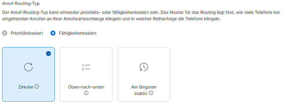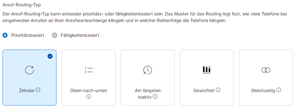 In diesem Bereich legen Sie fest, ob die Anrufverteilung Prioritätsbasiert oder Fähigkeitenbasiert verläuft. Sie legen hier also fest, nach welcher Logik Anrufe an Ihre Mitarbeiter/Agenten weitergeleitet werden sollen.