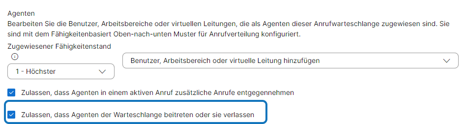 Zudem gibt es Checkboxen, die bei Aktivierung es ermöglichen, dass Agenten während eines aktiven Telefonats weitere Anrufe annehmen können bzw. Agenten eine Warteschlange beitreten oder verlassen können.