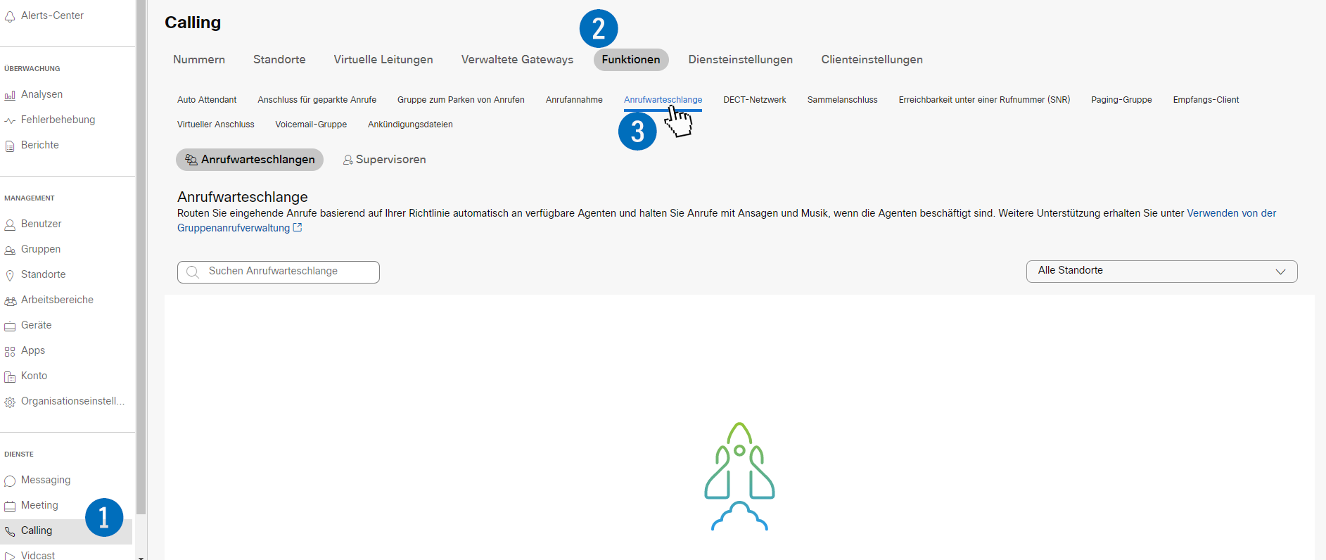 1.) Navigieren Sie zuerst zu der Warteschlange, für welche Sie die Einstellungen vornehmen wollen, indem Sie im (1) Bereich Dienste auf Calling, dann auf den (2) Reiter Funktionen und dann auf den (3) Menüpunkt Anrufwarteschlange. klicken.