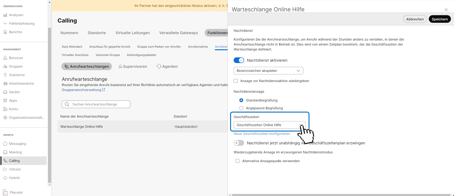Unter den Warteschlangenrichtlinien gibt es hier die Punkte Urlaubsdienst und Nachtdienst können, wie im folgenden Beispiel Ihre Anrufwarteschlange an die Geschäftszeiten ausrichten.