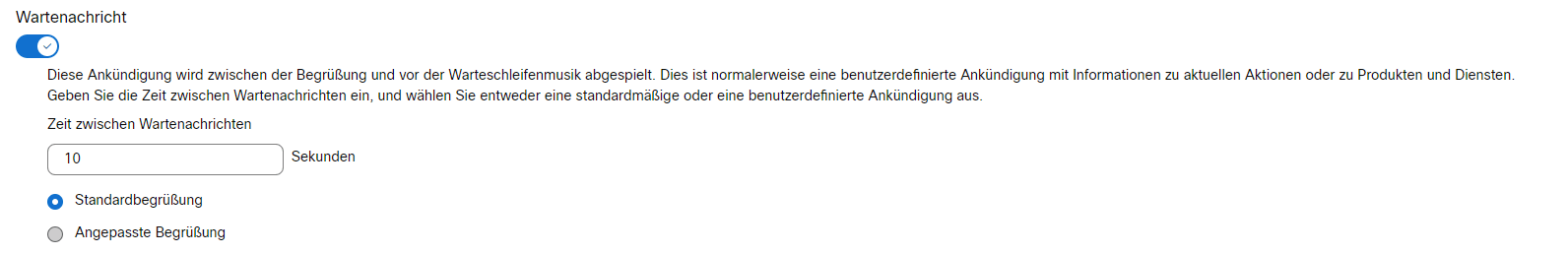 Diese Ankündigung wird zwischen der Begrüßung und vor der Warteschleifenmusik abgespielt. Dies ist normalerweise eine benutzerdefinierte Ankündigung mit Informationen zu aktuellen Aktionen oder zu Produkten und Diensten. Geben Sie die Zeit zwischen Wartenachrichten ein, und wählen Sie entweder eine standardmäßige oder eine benutzerdefinierte Ankündigung aus.