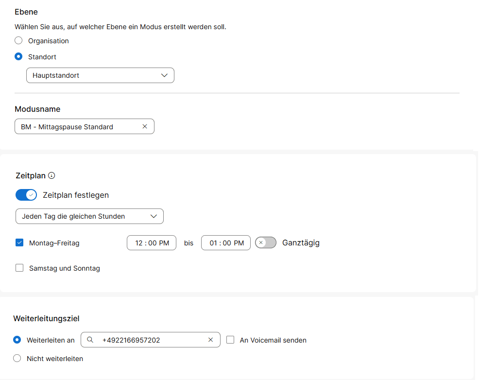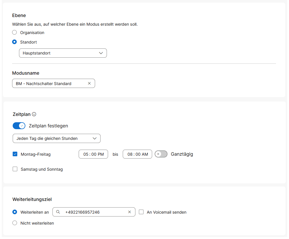 - Weiterleitungsziel: Hier wird die Option Weiterleiten an ausgewählt, sowie das die Rufnummer der Zentrale (entsprechend dem Szenario) ausgewählt.