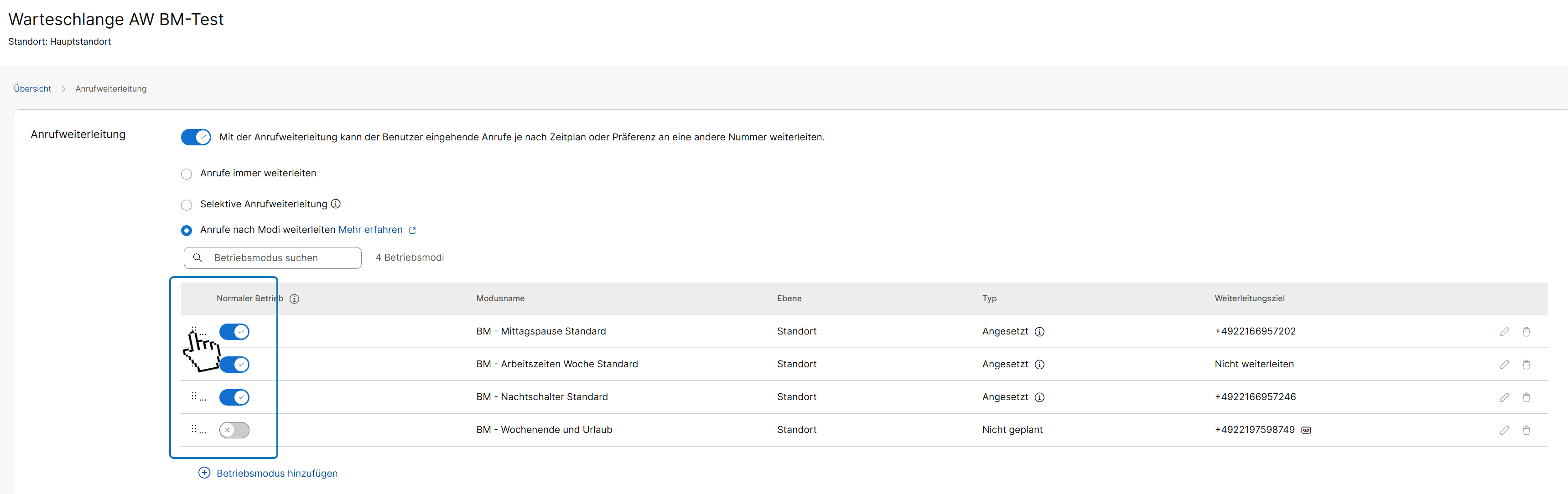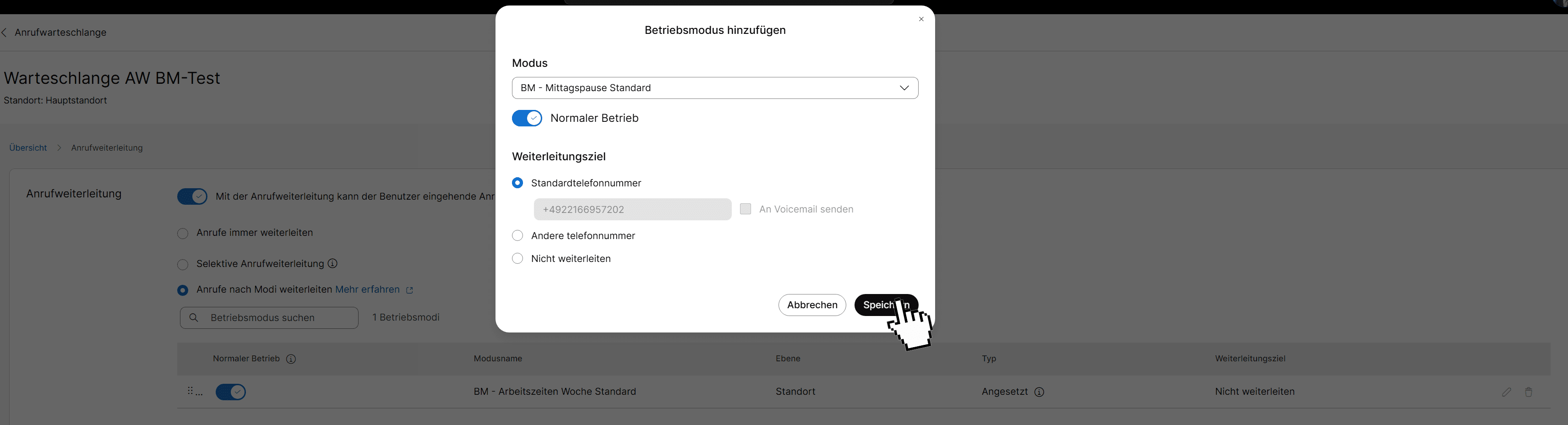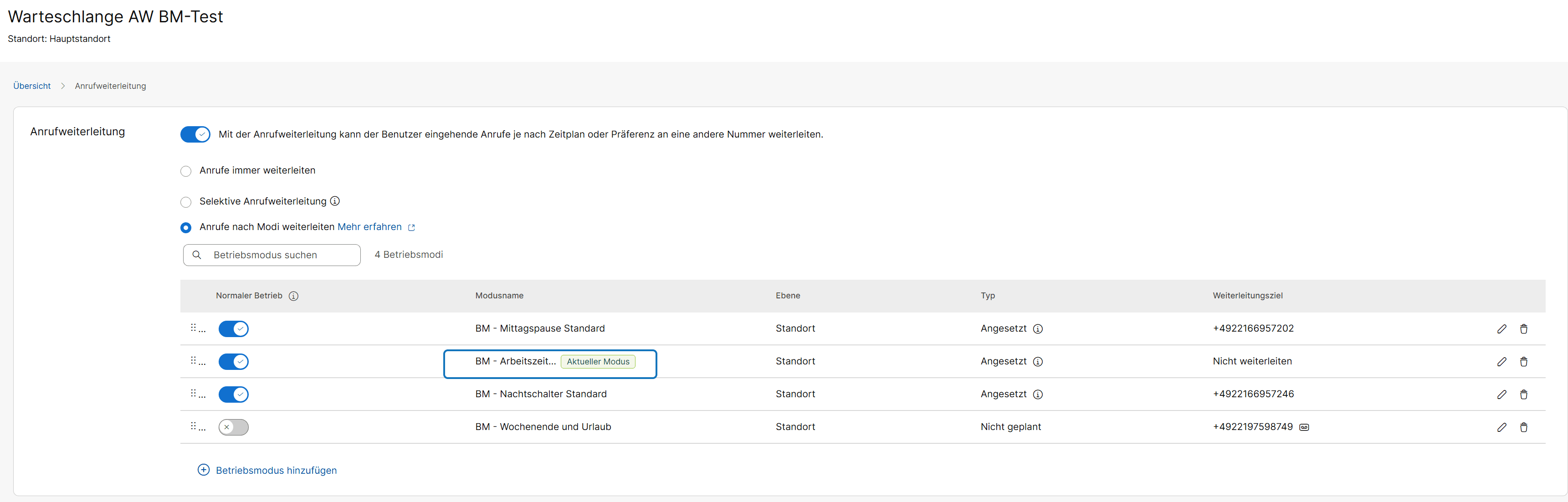 Der Betriebsmodus bzw. mehrere Betriebsmodi ist/sind eine effiziente Funktion, um eingehende Anrufe , abhängig von der Tageszeit, zu routen.