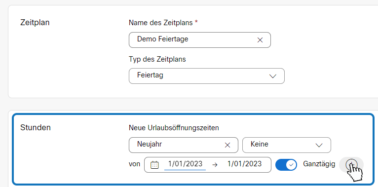 - Sollten Sie bei Typ des Zeitplans Feiertag ausgewählt haben, so erscheint ein (3) Bereich mit dem Titel Stunden.