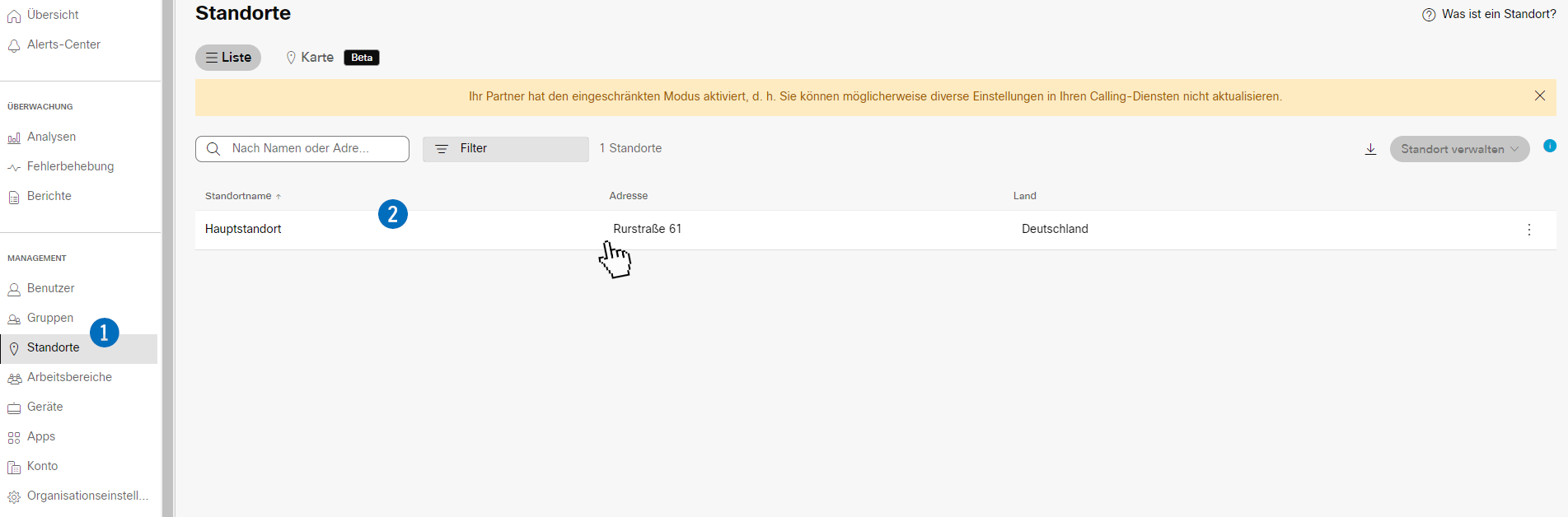 Im Control Hub klicken Sie in der linken Navigationsleiste im Bereich Calling auf Standorte und wählen Sie dann den Standort aus, für den Sie den Zeitplan anlegen möchten. In der Regel wählen Sie hier immer den Hauptstandort aus.