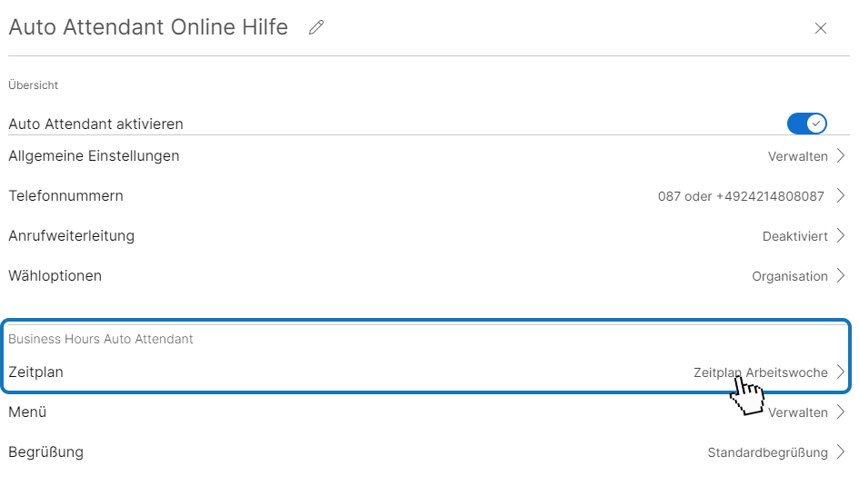Der Zeitplan ist nun dem Auto-Attendant zugewiesen. Das bedeutet, während der definierten Geschäftszeiten mit seinen Funktionen erreichbar ist und außerhalb der Geschäftszeiten der Anrufer eine entsprechende (vorher beim Auto Attendant definierte) Mitteilung erhält.