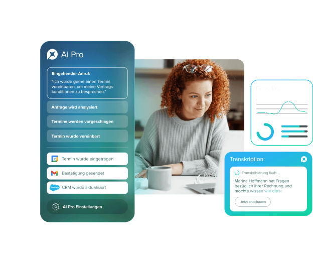 Der AI Voice Agent stellt sicher, dass kein Anruf verloren geht: Er beantwortet häufige Fragen direkt und vereinbart zuverlässig Termine mit Kundinnen und Kunden. So bleibt das Team auch bei hohem Anrufaufkommen entlastet – egal, ob jemand im Büro ist oder nicht.
