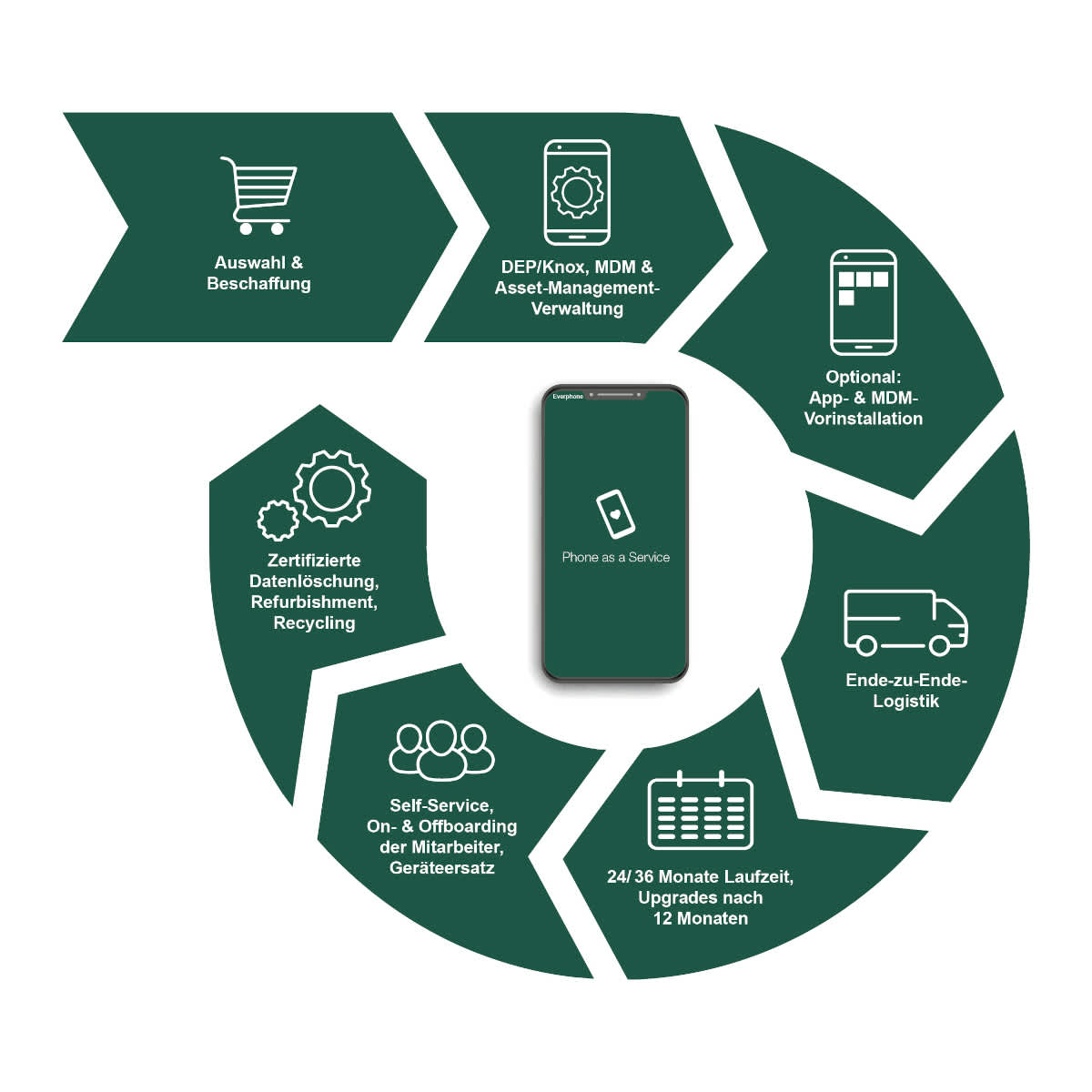 Interessant bei everphone ist, dass sie ausgemusterte Geräte weiterverkaufen und dadurch laut eigenen Aussagen sehr wettbewerbsfähige Preise im Rundum-sorglos-Service anbieten können. Das Rundum-Sorglos-Paket beinhaltet wie auch bei den anderen Dienstleistern das komplette Handling vom Einkauf, über die Einrichtung bis hin zur Ausgabe an die Angestellten.
