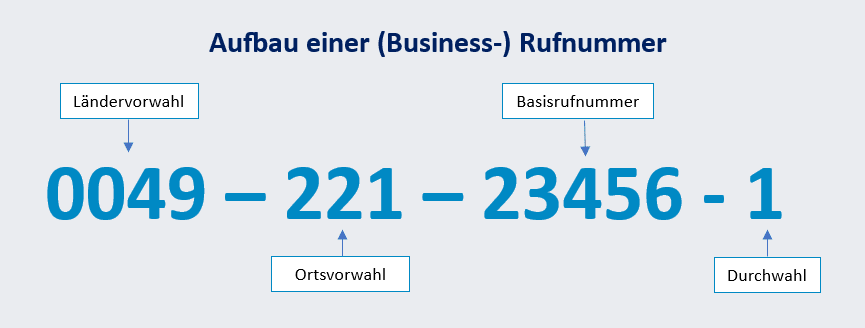 Eine Rufnummer aus einem Rufnummernblock setzt sich aus einer Vorwahl (z.B. 0221), einer Basisrufnummer (z.B. 23456) sowie einer Durchwahl (z.B. 1) zusammen. Die Basisrufnummer wird häufig auch als Rufnummernstamm bezeichnet. Durch diesen Aufbau ist es möglich, jeder Nebenstelle einer TK-Anlage eine eindeutige Durchwahl zuzuweisen.