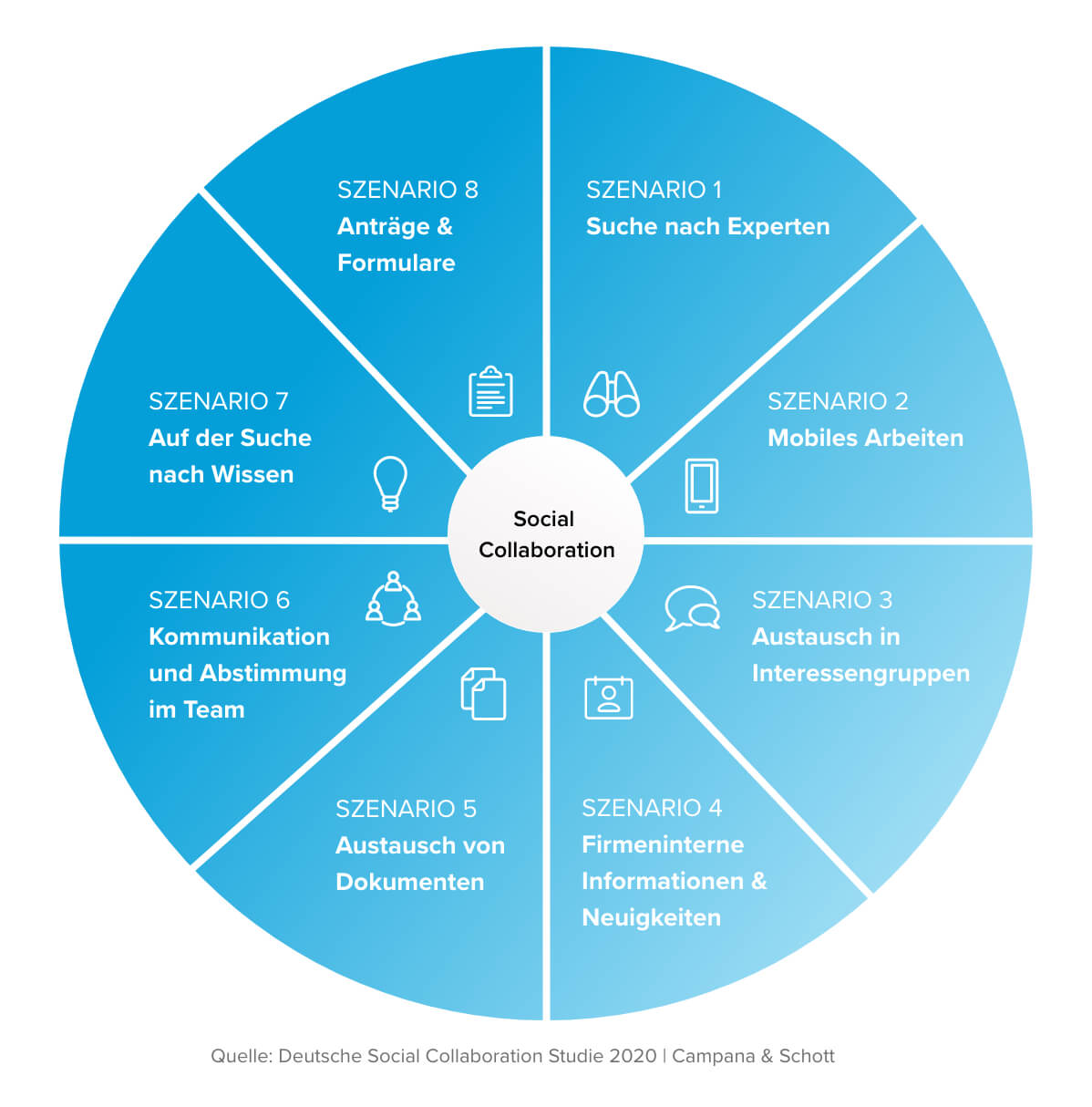 Social-Collaboration-Technologien sind vor allem dann erfolgreich, wenn sie sinnvoll in die bestehenden Arbeitsprozesse integriert und mit verschiedenen, aufeinander abgestimmten Change-Management-Maßnahmen begleitet werden.” (Deutsche Social Collaboration Studie 2020 – Campana & Schott)