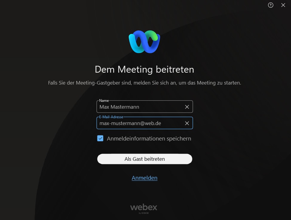 ❸ Im nächsten Schritt müssen Sie Ihren Namen und Ihre E-Mail Adresse eingeben. Kleiner Hinweis: Dieser Name wird den anderen Teilnehmern später auch im Meeting angezeigt. Speichern Sie die Anmeldeinformationen und wählen Sie aus, ob Sie Webex als Gast beitreten möchten (mit eingeschränktem Funktionsumfang) oder ob Sie sich bei Webex anmelden möchten und somit auf alle Funktionen zugreifen können.