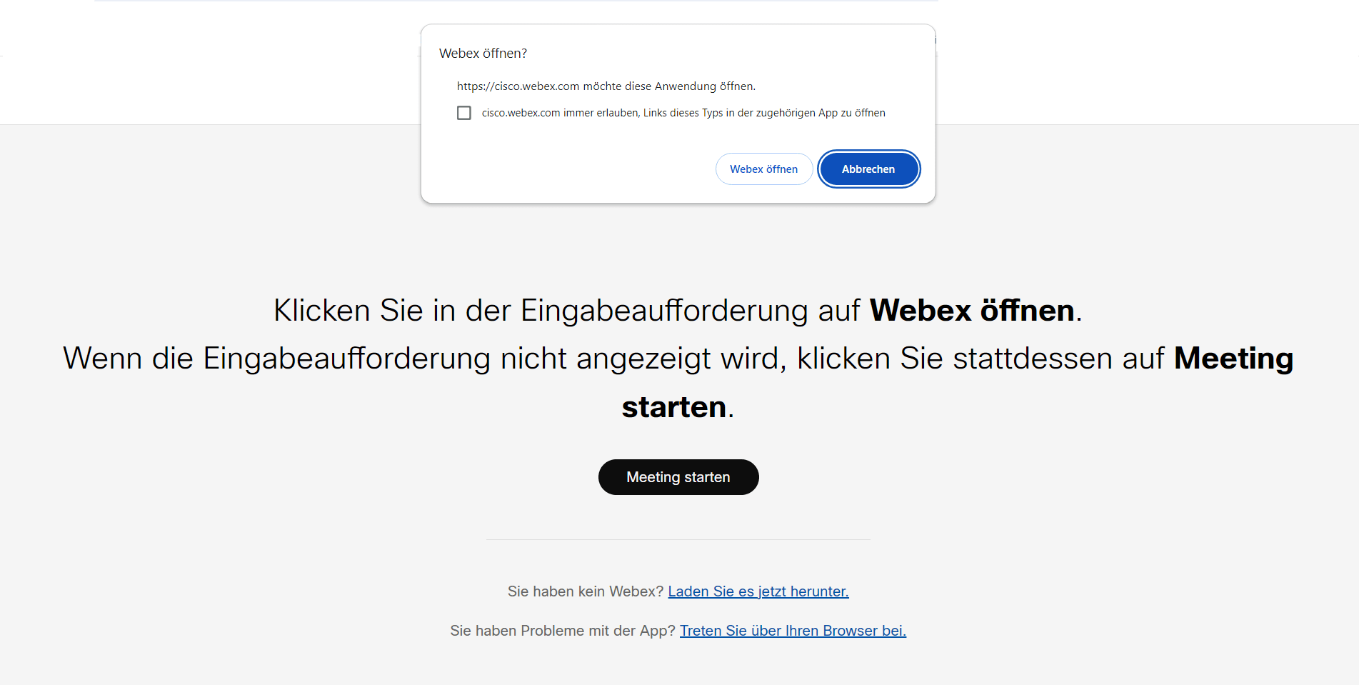 ❷ Sollten Sie zum ersten Mal an einem Webex-Meeting teilnehmen, wird die Webex App automatisch auf Ihrem Computer heruntergleaden. Befolgen Sie die Installationsanweisungen und klicken Sie danach auf “Webex öffnen” oder auf “Meeting starten”.
