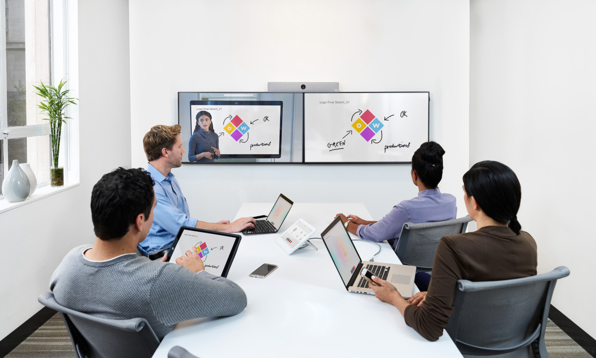 Das Cisco Room Kit ermöglicht die virtuelle Zusammenarbeit in mittelgroßen Konferenzräumen durch einfaches Hinzufügen von einem oder zwei Bildschirmen.