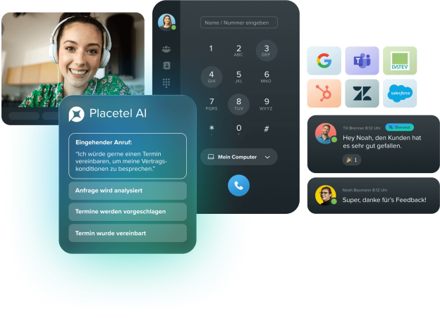 Zufriedene Gesichter: Verschiedene Teams erzählen, wie die Lösungen von Placetel ihren Arbeitsalltag vereinfachen.Â